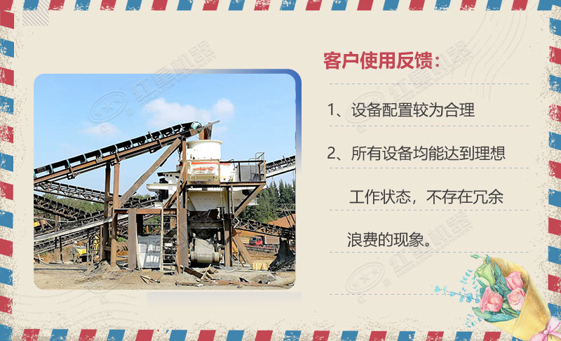 整條制沙生產線設備配置較為合理,所有設備均能達到理想工作狀態,不存在冗余浪費的現象,且產出的沙石成品也都不錯(可以賣上好價錢),僅投產半年已處于盈利狀態,客戶表示很滿意!